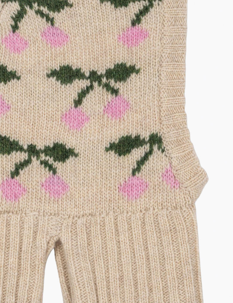 A warm and comfy balaclava with rib knit hems for a comfortable fit. Made from a soft wool blend fabric. This balaclava features the most adorable pink cherry print.
