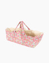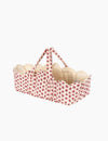 Padded doll carrier designed with practical carry straps, soft piping, and scallop hems.