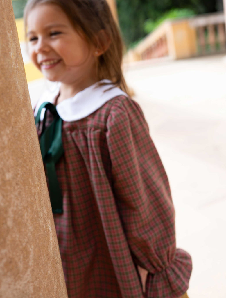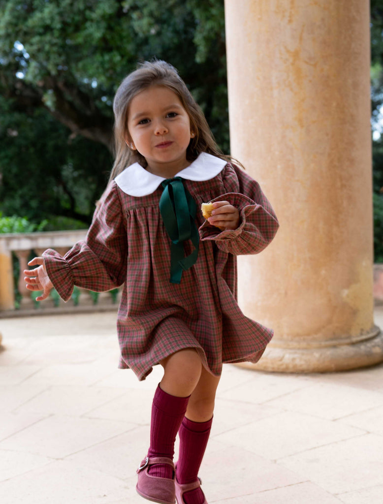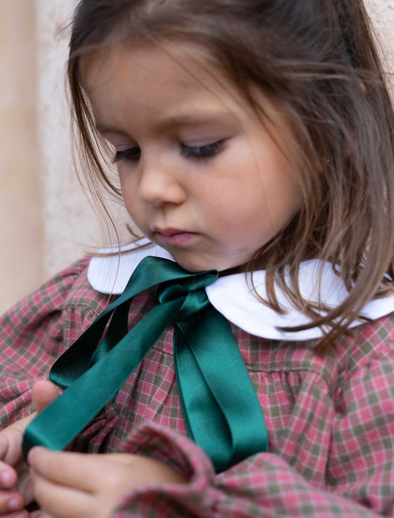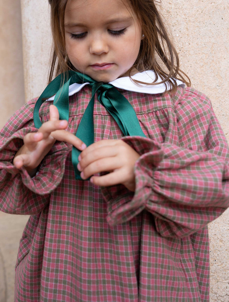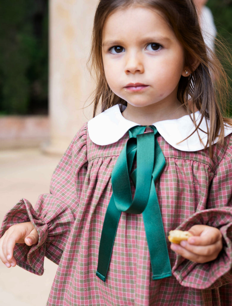 The White Rabbit Dress by Carlota Suip is part of the brand’s Alice in Wonderland–inspired winter collection — a nostalgic nod to timeless storybook style. Vintage-inspired dress in soft 100% cotton flannel with a powdery red and green check. Fully lined through the yoke and skirt in 100% cotton for comfort and structure. Features puffed sleeves with delicate frilled cuffs and a crisp white Peter Pan collar in 300-thread count cotton twill. A forest green satin bow ties at the neckline, adding a refined touch. Closes at the back with a teardrop opening and wooden button. Includes 4 cm of extra hem to adjust as your little one grows.