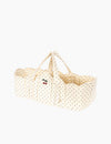 Padded doll carrier designed with practical carry straps, soft piping, and scallop hems.