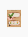 A charming set of two handcrafted crochet hair clips in pink and cream. The first clip features a delicate pink tulip motif with green leaves, while the second is adorned with a row of embroidered tulips. Both clips have a pink crocheted border framing a cream base, with snap clip fastenings. A sweet, artisanal accessory that adds a playful, handmade touch to any outfit — please note all hair accessories are final sale and cannot be returned or exchanged.