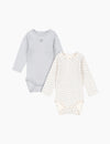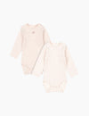 This organic cotton body is a soft, stretchy, and exceptionally comfortable must have in your baby's wardrobe. Designed with a classic rib neck and push buttons at the shoulder for easy dressing. This basic essential is made in an organic cotton and modal blend mixed with elastane for added durability and stretch. 2 pack includes one solid bodysuit with a sweet print of two kittens drinking from a plate and one printed long sleeved bodysuit.