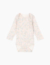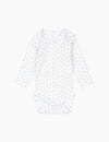 Soft organic cotton bodysuit with long sleeves. Made in a flexible rib cotton with a convenient envelope neck feature that makes it easy to take on and off, as well as easy push buttons between the legs for diaper changes.