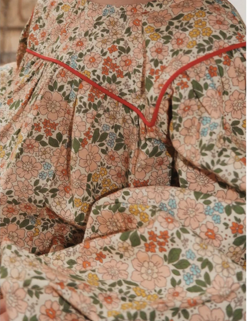 The Emma Dress is made of cotton with a beautiful Liberty inspired floral print. It features an invisible back placket with mother-of-pearl buttons and delicate puffed sleeves. The dress has a gathered yoke at the front and back with a contrast-colored trim, making this A-line dress truly charming.