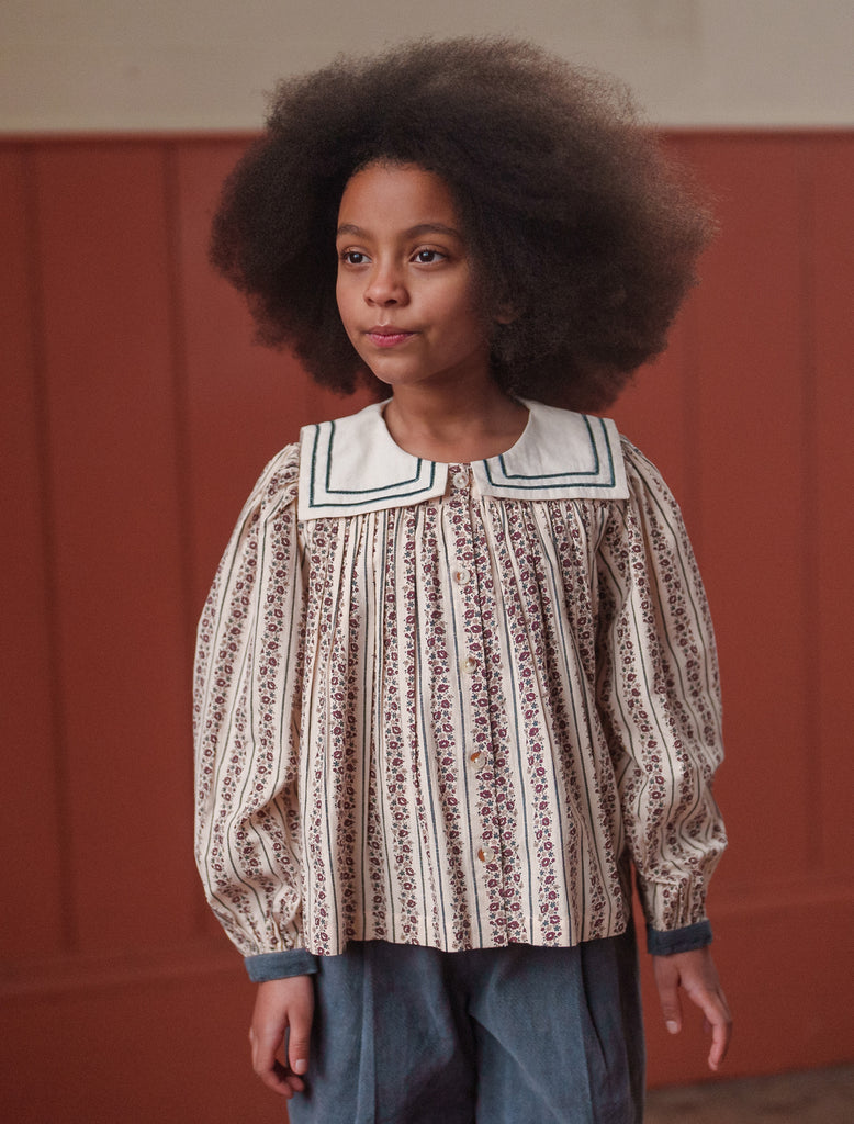 The Petra Blouse is a pretty, vintage inspired sailor blouse made in an organic, mallory floral fabric. It has a white sailor collar with rows of contrasting velvet ribbon and full sleeves with velvet button-up cuffs. The perfect blouse to pair with matching bloomers for an adorable look.