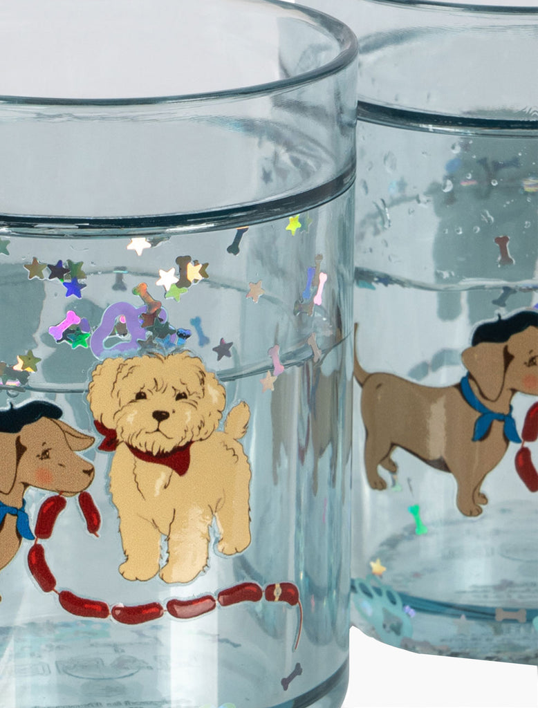 These bestselling glitter cups are back! These adorable cups feature two adorable puppies with sausage links. Gently shake and the glitter will playfully dance around. Set of two cups. Please note these cups stand about 3.5" tall and can hold up to 6oz of liquid.