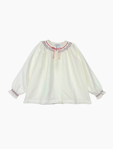 We love this bohemian-style Aria blouse with contrasting hand-smocking and embroidery on soft, easy-care organic double gauze cotton. It features an open neckline that is entirely smocked and embroidered by hand and a velvet ribbon at the neckline. It has long sleeves gathered at the cuffs with hand-smocking and embroidery at the cuffs and is partially buttoned at the front.