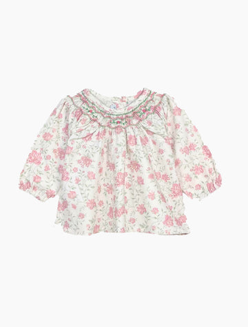 The Margot blouse asserts its bohemian, refined style with its handmade embroideries. We love it for the delicacy of its contrasting color smocks. It is made from 100% organic twill cotton and is a long-sleeved blouse with a round neckline. It is fully buttoned at the back with pretty mother-of-pearl buttons. It features hand-made smocks all around the neckline and hand-embroidered roses. It's this season's must-have blouse for everyday wear. Pair it with gorgeous velvet baby pants for a stylish winter outfit.