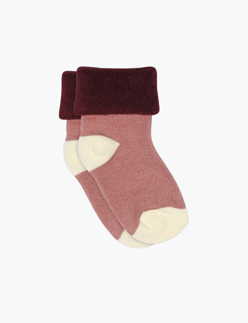 Classic terry baby sock with contrasting colors on the heel, toe and folded edge. Knit from the softest cotton blend yarn with a soft cotton terry quality on the inside, these socks are designed to stay put with a wide fold with comfort and fit in mind. These socks run small, we recommend buying one size up for longer wear.