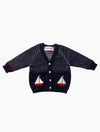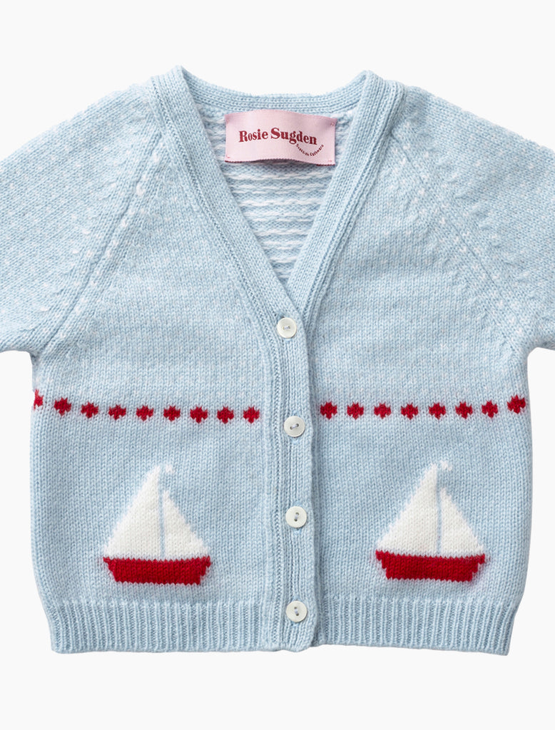 The most adorable cashmere baby cardigan featuring the most adorable boat motif. These cardigans are made from 100% 3-ply cashmere in a family-run mill in the Scottish Borders. Perfect for keeping babies cozy, this cardigan is also super soft on delicate skin. With a classic v-neck, ribbed cuffs and pearlescent buttons, each cardigan is finished with just the right touch of nautical charm.