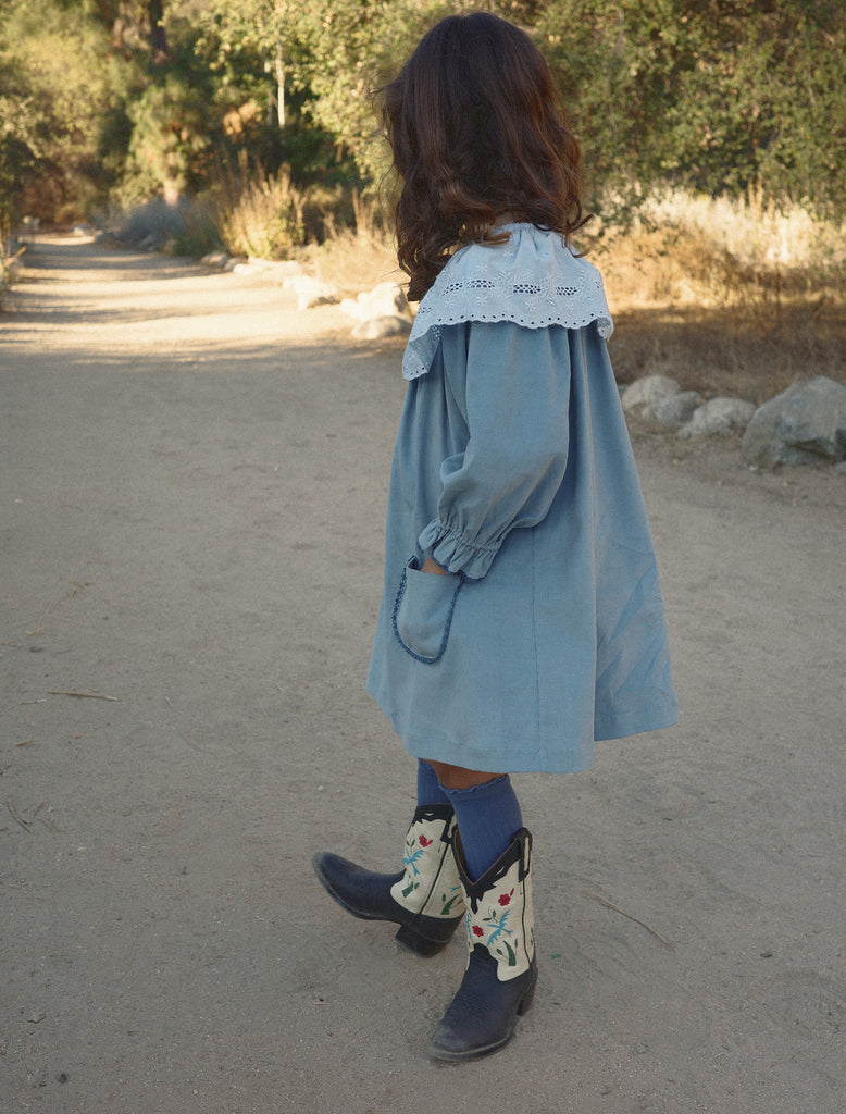 A long sleeved version of Atelier Zuzu's signature silhouette, the Sofia Dress is crafted in a nostalgic mini corduroy for effortless comfort and charm. A sweet scallop embroidered trim finishes the ruffle neckline for a whimsical touch. Designed for ease and comfort with a pull-over fit and gentle elastic at the neckline and sleeves, the Sofia Dress is a timeless treasure—ready to be worn, loved, and passed down.