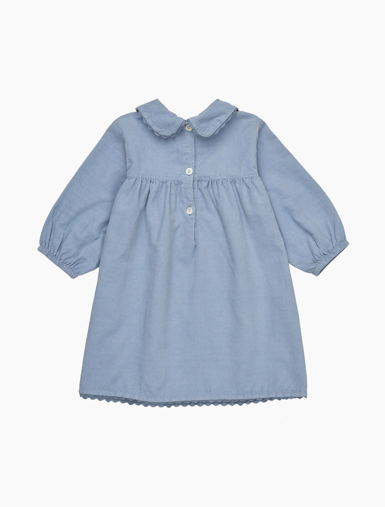 This charming Antoinette Baby Dress combines a playful collar and sweet lace trim detail, made to be your little girl's new favorite. Crafted from soft, 100% cotton corduroy in a delightful blue shade, it offers cozy comfort and timeless style for any occasion.