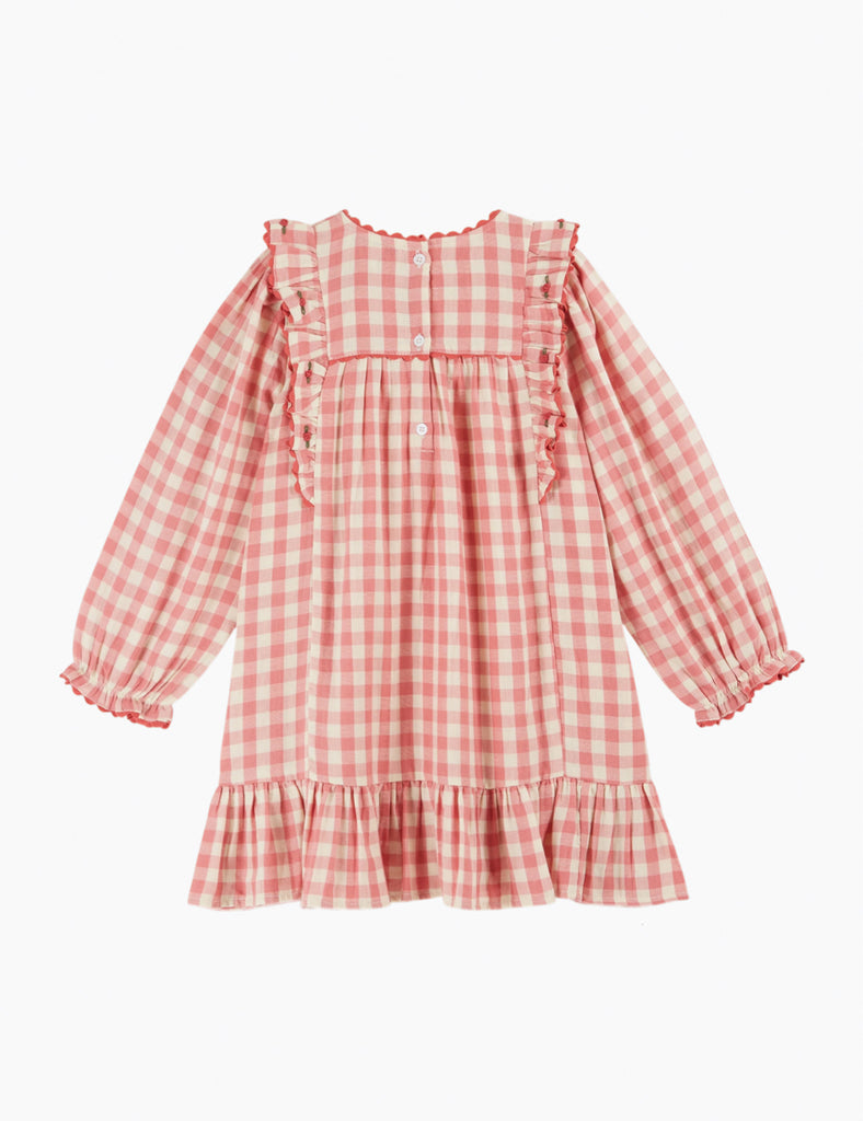 This playful long sleeve dress features soft 100% cotton fabric in a charming pink gingham pattern. Delicate ric rac trim accents the neckline and sleeves, while tiny hand embroidered rosettes along the bib add a sweet, whimsical touch. Perfect for the Fall season!