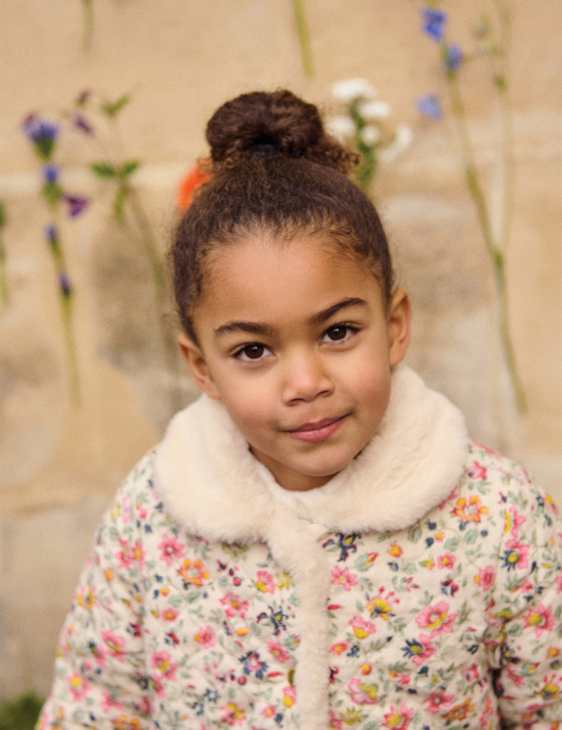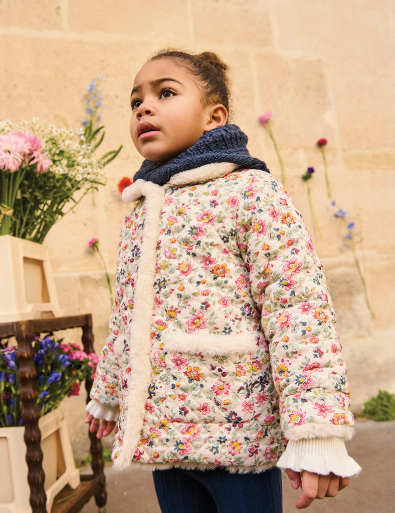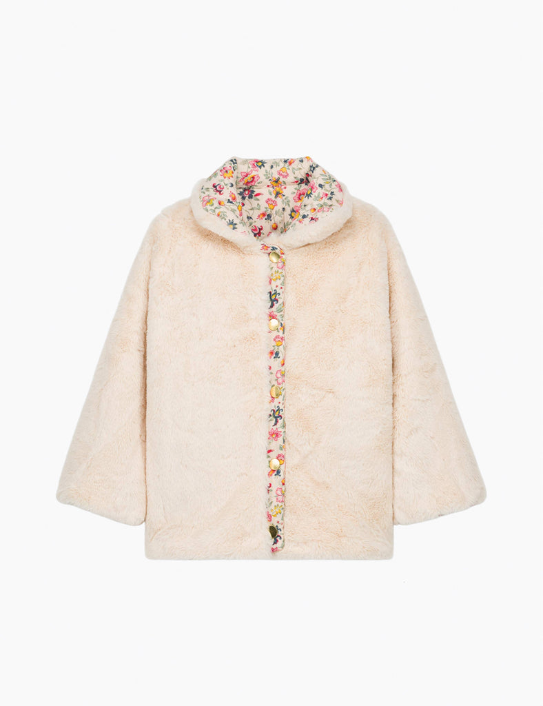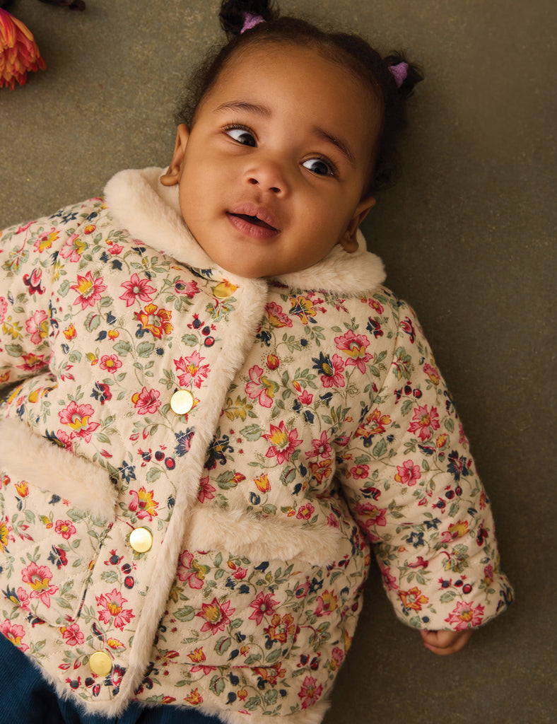 Wrap yourself in whimsy with the Dalila Reversible Coat in Cream & Wild Flowers. One side features charming quilted floral double cotton gauze made from organic cotton, while the flip side offers cozy ultra-soft faux fur. Fully lined collar and snap fastening keep you snug, and front patch pockets edged with faux fur add a fun touch on the floral side. Perfect for playful days and chilly nights!