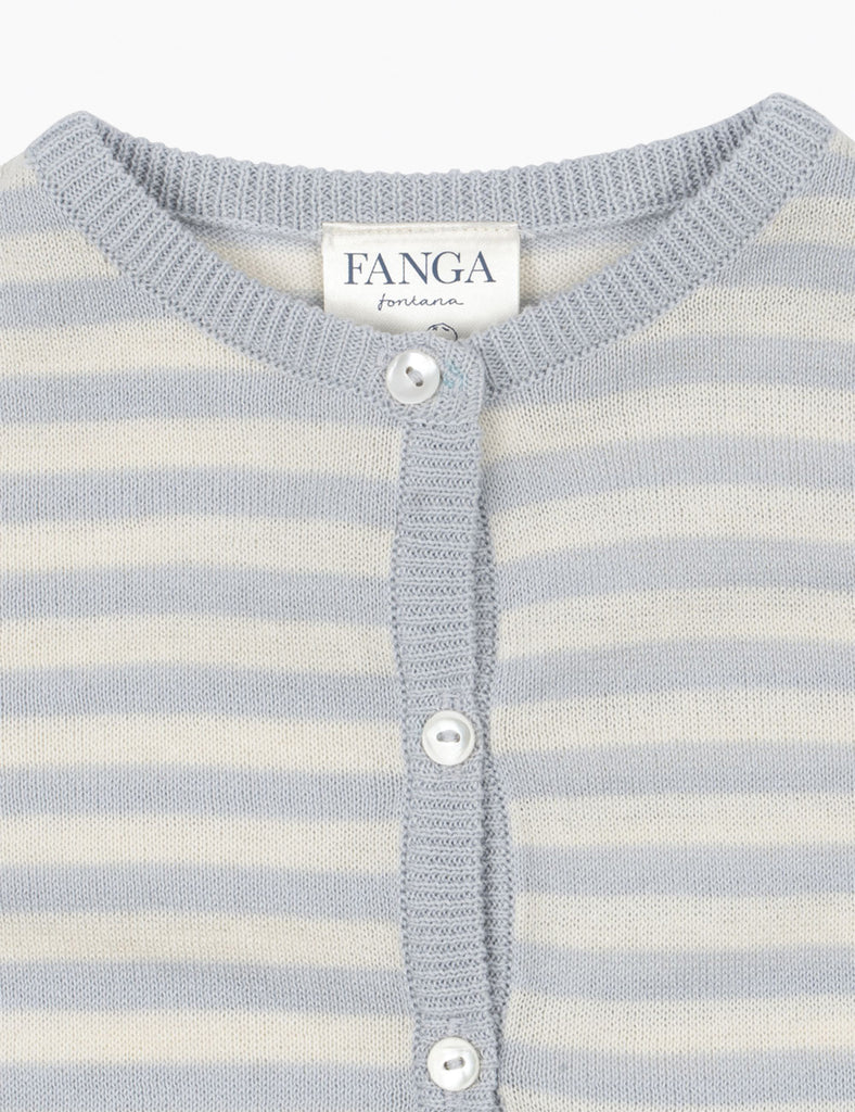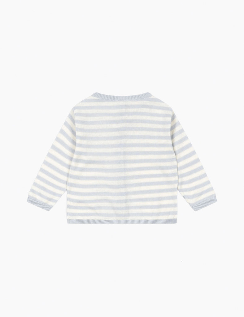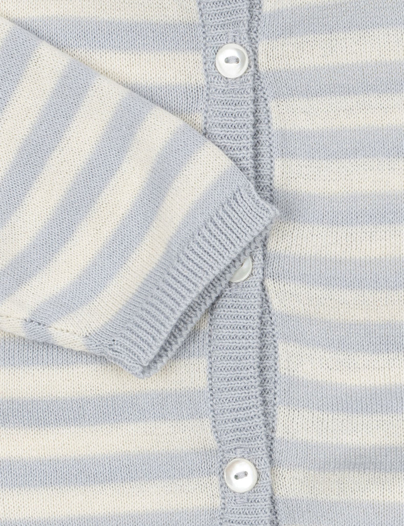 Light cardigan in a delicate knit pattern with adorable stripes. Made from 100% organic cotton that is soft and breathable, and designed with scallop edges and mother of pearl buttons in front.
