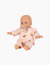 The Elisa doll is the sweetest little baby doll — Ready to be loved in her soft two-piece pink cotton set adorned with red rosettes. She has a detachable cherry printed pacifier.