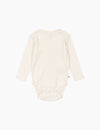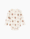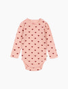 Our favorite pointelle fabric is back this season in a very cute way! The Minnie Bodysuit is a great base layer that has sweetest design details including picot trim around the neck and sleeves, a satin ribbon at the front chest, and an allover red heart print with a light pink base layer. Snap buttons at the shoulder and bottom for easy changes!