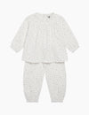 A delightfully charming set for kids in a white muslin fabric with a tiny floral print all over, including a vintage-style blouse with button-back and stretchy balloon pants. This set is perfect for everyday wear!