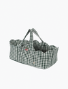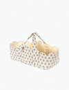 Padded doll carrier designed with practical carry straps, soft piping, and scallop hems.