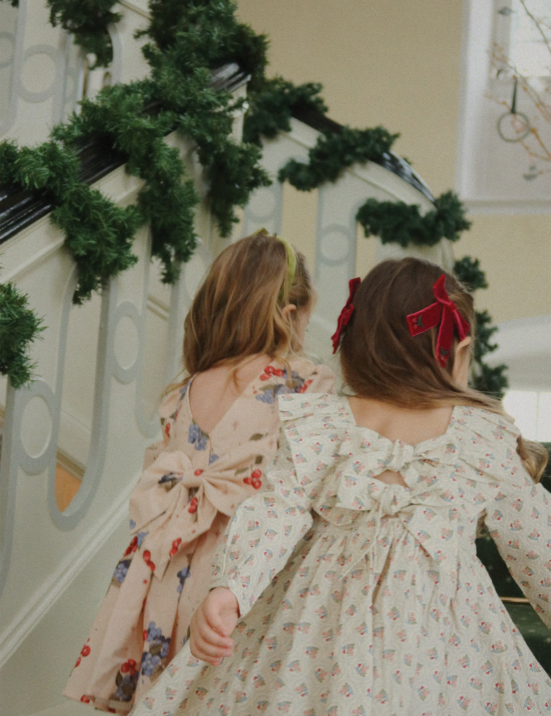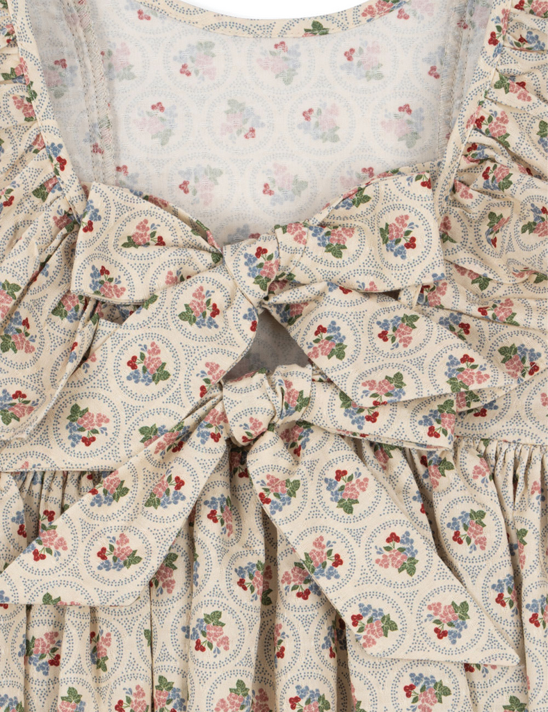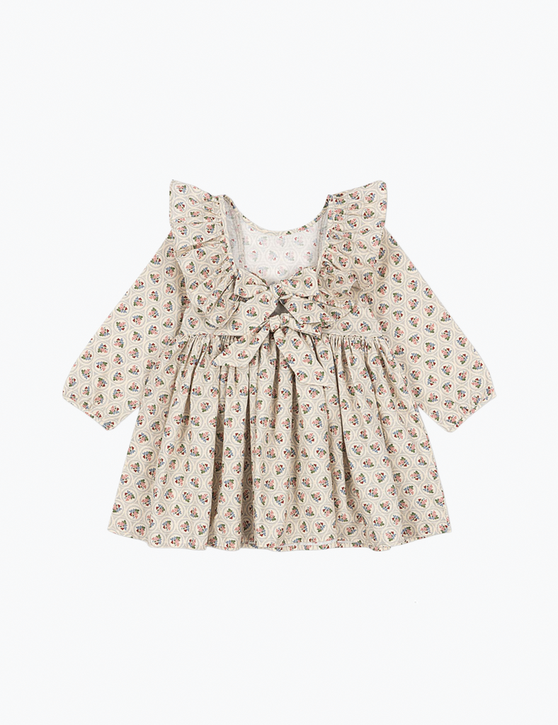 This gorgeous Cianna LS Bow Dress in Verona Blues offers a playful twist on a classic style. Crafted from 100% organic cotton, it features a slightly fitted top flowing into a full voluminous skirt with elegant detailing. The frill details at the sleeves and low-cut back adorned with two large bows adds a sweet touch. Perfect for those who love comfort with a dash of whimsy.