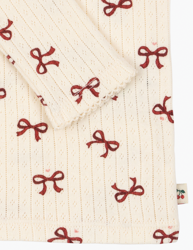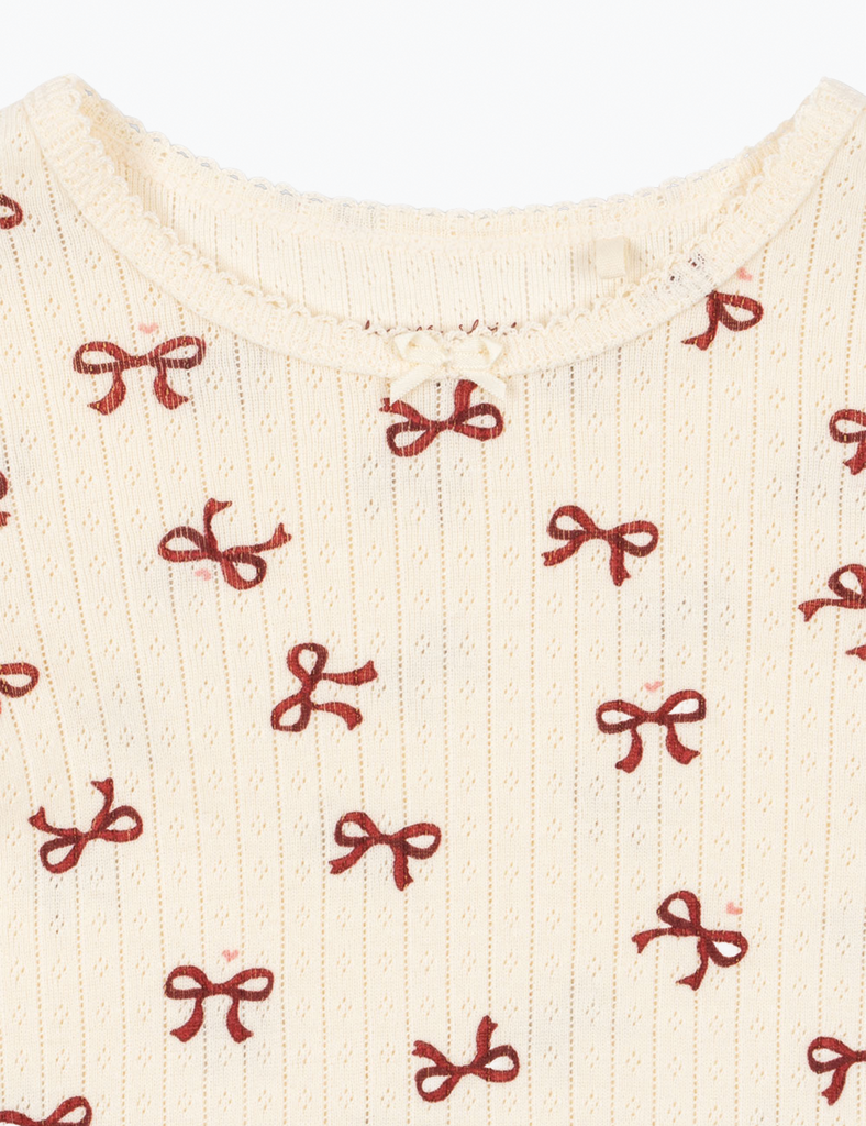 The Minnie Top is made from the softest organic cotton pointelle. A great base layer that has the sweetest design details including picot trim around the neck and sleeves, a satin bow at the front chest, and an off white base. Made from 100% organic cotton. Please note sizes 9M - 18M have snap closures at the shoulder for an easier change.