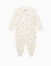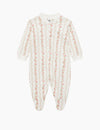 Keep your little one cozy and comfortable in this adorable baby sleepsuit from Sleepy Doe! Made from 100% organic cotton, in a super soft interlock fabric that washes really well + has a great fit with the snap button closures. It features an allover floral and stripe wallpaper design on an off white base.