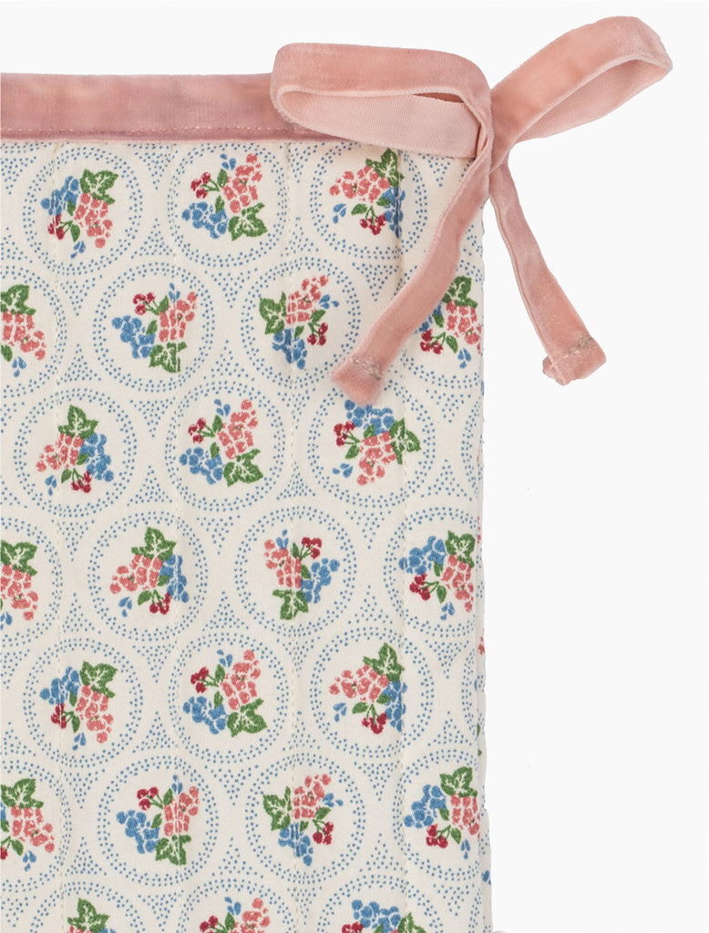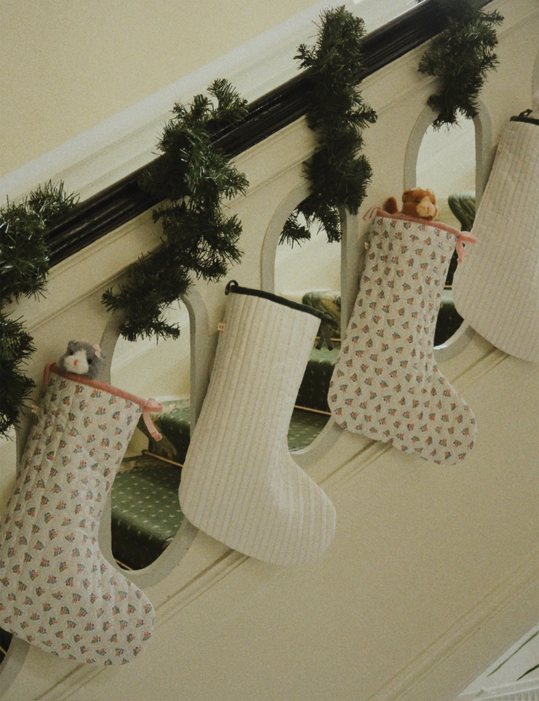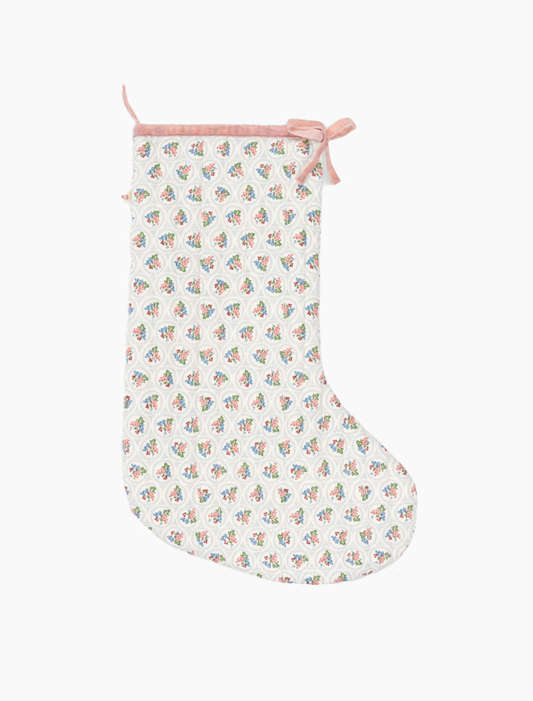 The most adorable Christmas stocking with a gorgeous pink, blue, and green allover floral print and a velvet pink trim with a pink bow. This beautiful Christmas stocking has an attached loop, making it easy to hang. Wishing you a Christmas filled with surprises and stocking treasures.