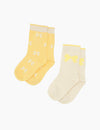 Made from a super-soft cotton blend knit, this set of two knitted socks feature an allover smaller bow motif on an off-white ground and one single bow motif on yellow ground. The fit on these hit mid shin, providing a little more coverage than an ankle sock.
