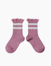 Introducing the Nicole Ribbed Varsity Crew Socks in rose — a chic little addition to their accessory collection! These sweet socks feature a ribbed design with a lace trim and two sporty white stripes.