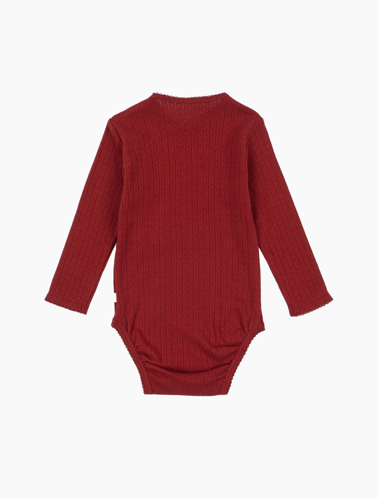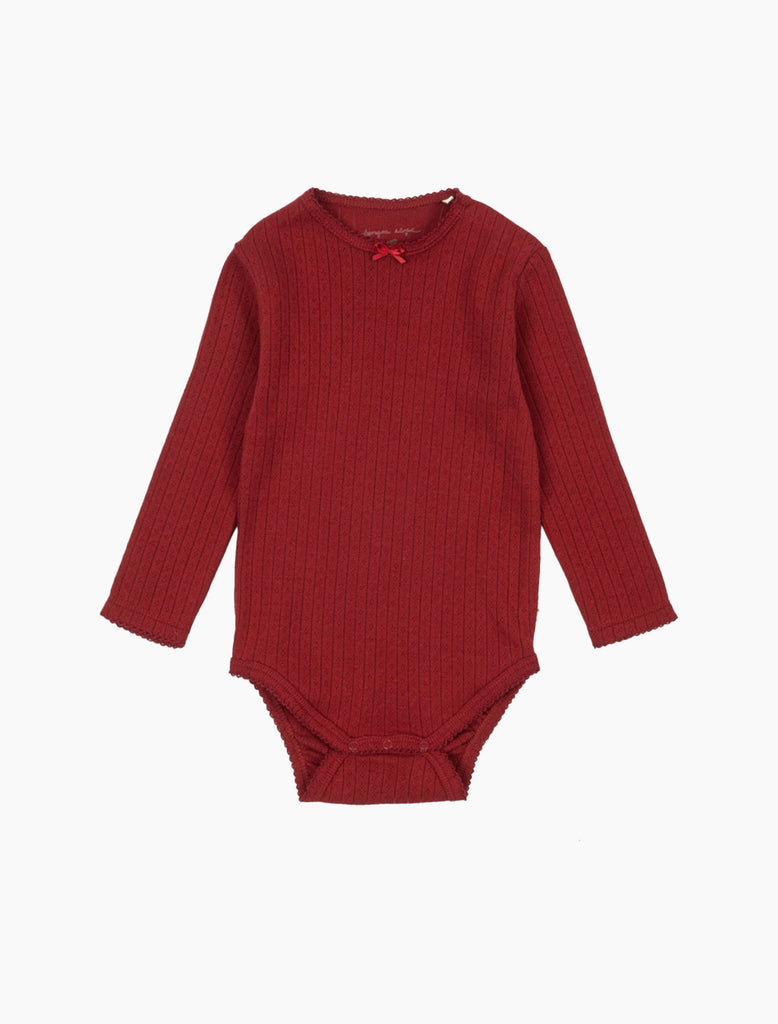Our favorite pointelle fabric is back this season in a very cute way! The Minnie Bodysuit is a great base layer that has sweetest design details including picot trim around the neck and sleeves. Snap buttons at the shoulder and bottom for easy changes!