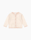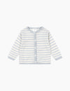 Light cardigan in a delicate knit pattern with adorable stripes. Made from 100% organic cotton that is soft and breathable, and designed with scallop edges and mother of pearl buttons in front.