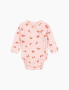 Soft long-sleeved wrap style bodysuit for newborns in a classic blue stripe with a lemon print at the chest. This wrap style bodysuit for newborns features snap buttons along the sides and bottom that make it easy to dress/undress baby.