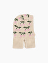 A warm and comfy balaclava with rib knit hems for a comfortable fit. Made from a soft wool blend fabric. This balaclava features the most adorable pink cherry print.