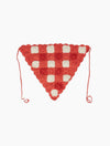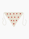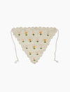 A gorgeous triangular ecru crochet headscarf crafted in a textured, granny-square style pattern. Each square is delicately adorned with small embroidered flowers in soft pink and warm yellow, accented with green stems. The scarf features a beautifully scalloped edge that follows the triangular silhouette, adding a vintage, handcrafted charm. Two slender crocheted ties extend from the top corners, designed to fasten under the chin or at the nape of the neck for a secure and adjustable fit.