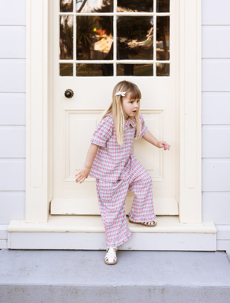 Crafted in Elma's Folk Check cotton, these 'pillowcase' inspired pants feature a wide, flowing leg and an elastic waist that’s easy to slip on, with a self-tie for an adjustable fit. The waistband and hem are adorned with flat ruffles, adding a playful touch. Finished with side pockets, ideal for little hands to store small treasures. For an adorable, coordinated outfit, pair them with the Dune Blouse.