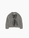 Baby girl cardigan made from a soft, fluffy wool and recycled polyamide cable-knit tricot. It features a rounded neckline, ribbed neck, cuffs, and hem. Front ties with bows in a flannel fabric.
